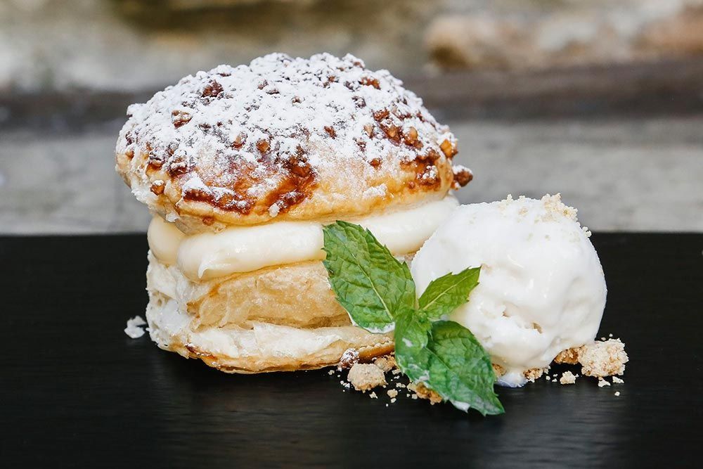 Pantxineta templada con chocolate caliente